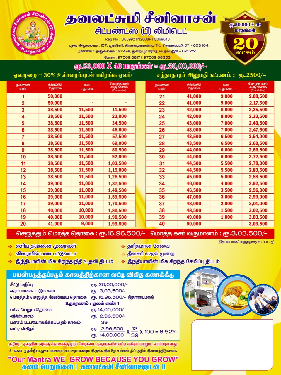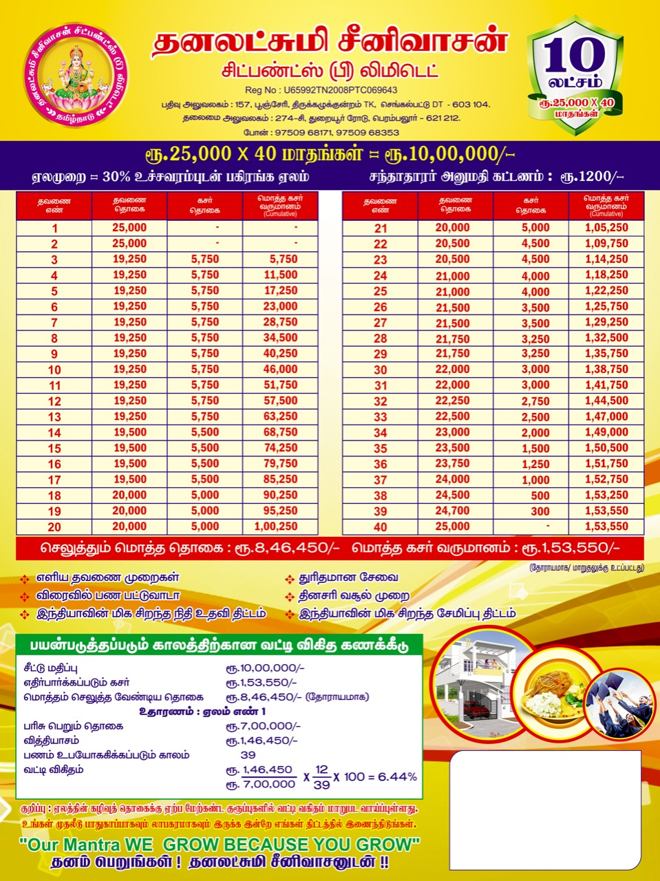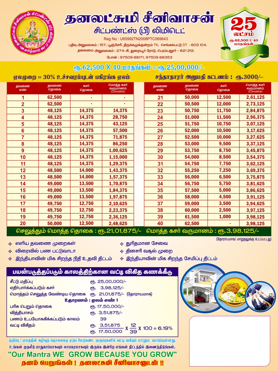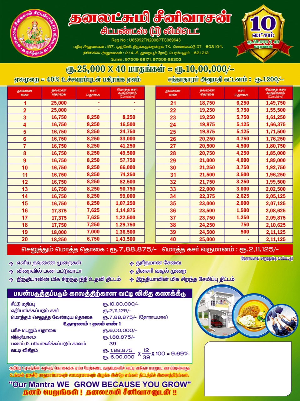 CHIT provides a good source of finance for different type of people viz., small investors, businessmen, small scale industrialists etc. CHIT is a good means of savings for any contingency requiring substantial amount. It serves all persons whether they desire for savings or borrowing to meet extraordinary expenses on special occasions like Marriages, Construction of houses , business , Education etc., Adequate care is necessary to choose a suitable Group. The selection of a particular Group, largely depends on the subscriber’s capacity to provide surplus funds month after month from his normal income for this purpose. This aspect is very important for the subscriber as well as the company’s point of view to avoid any embarrassment at the time of releasing the prize money or in releasing chit instalments month after month.