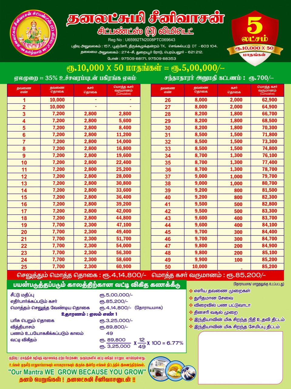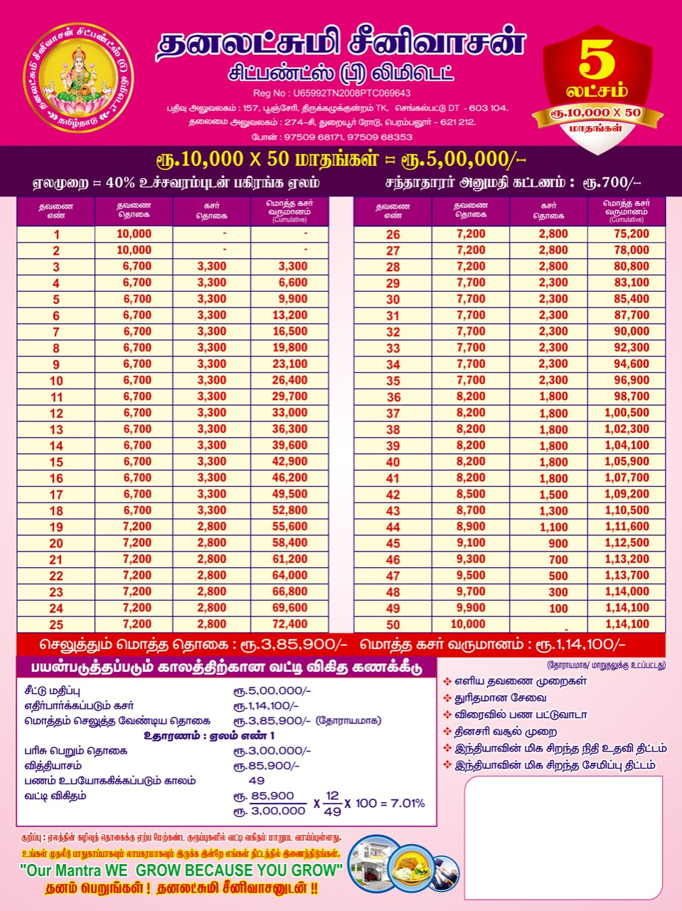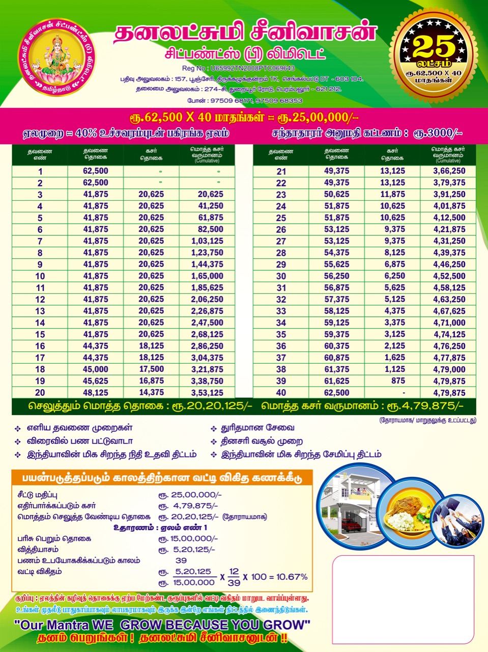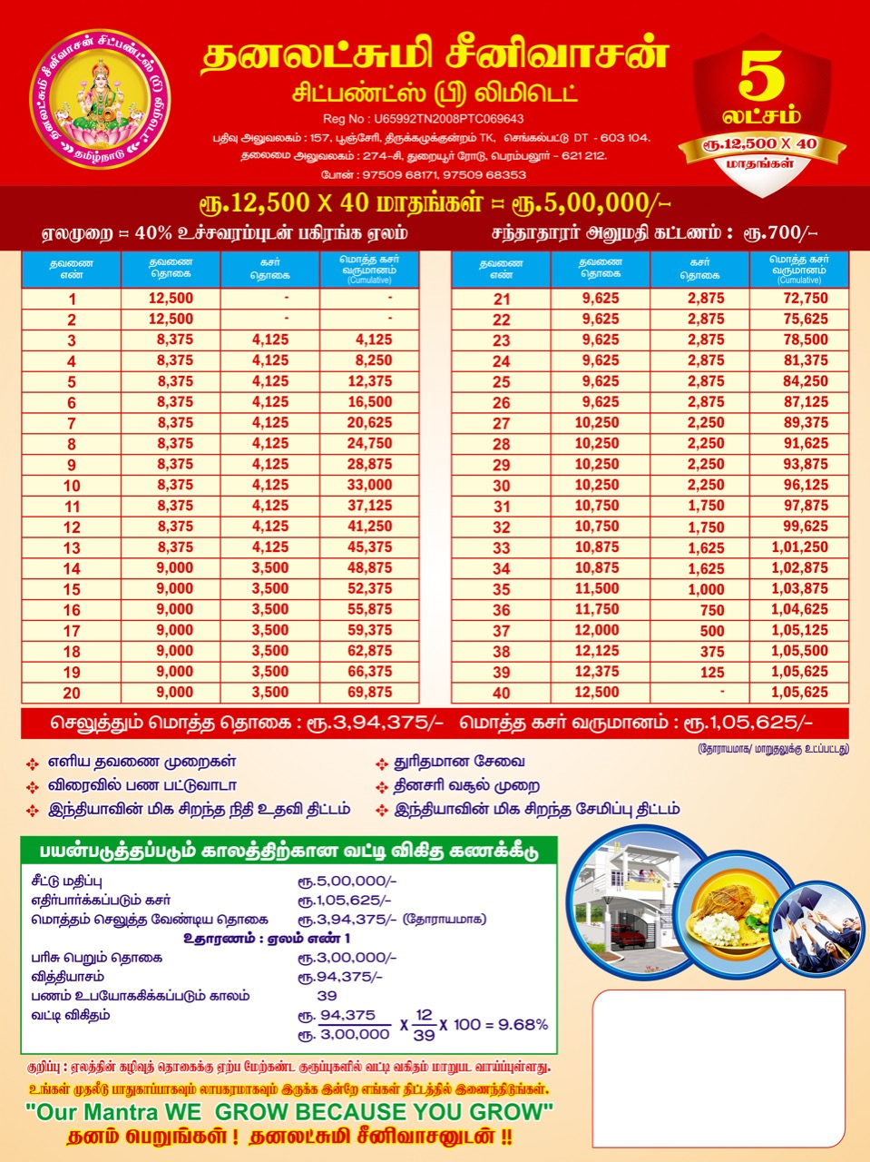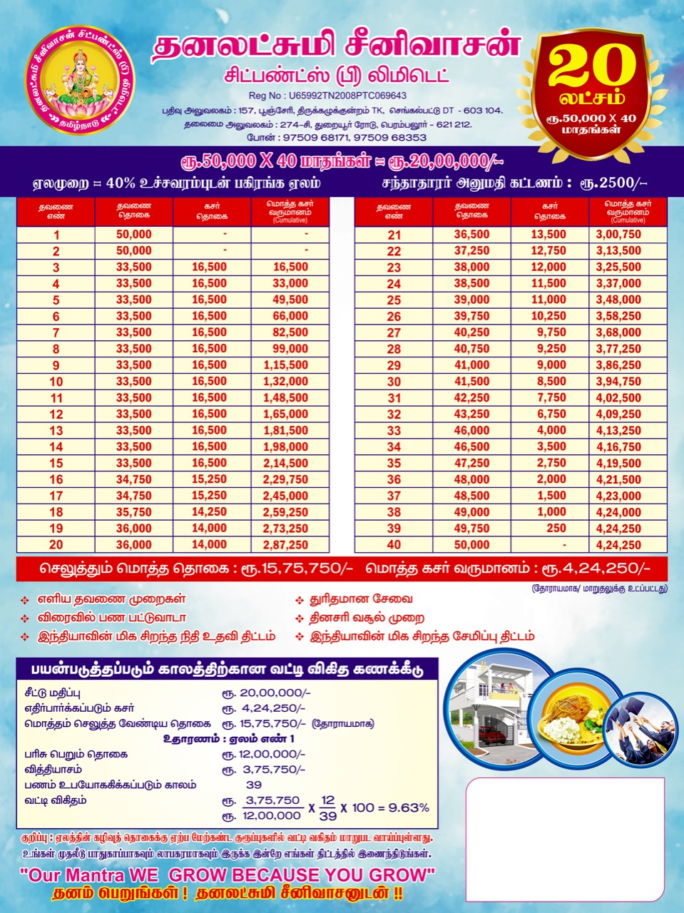 CHIT provides a good source of finance for different type of people viz., small investors, businessmen, small scale industrialists etc. CHIT is a good means of savings for any contingency requiring substantial amount. It serves all persons whether they desire for savings or borrowing to meet extraordinary expenses on special occasions like Marriages, Construction of houses , business , Education etc., Adequate care is necessary to choose a suitable Group. The selection of a particular Group, largely depends on the subscriber’s capacity to provide surplus funds month after month from his normal income for this purpose. This aspect is very important for the subscriber as well as the company’s point of view to avoid any embarrassment at the time of releasing the prize money or in releasing chit instalments month after month.
